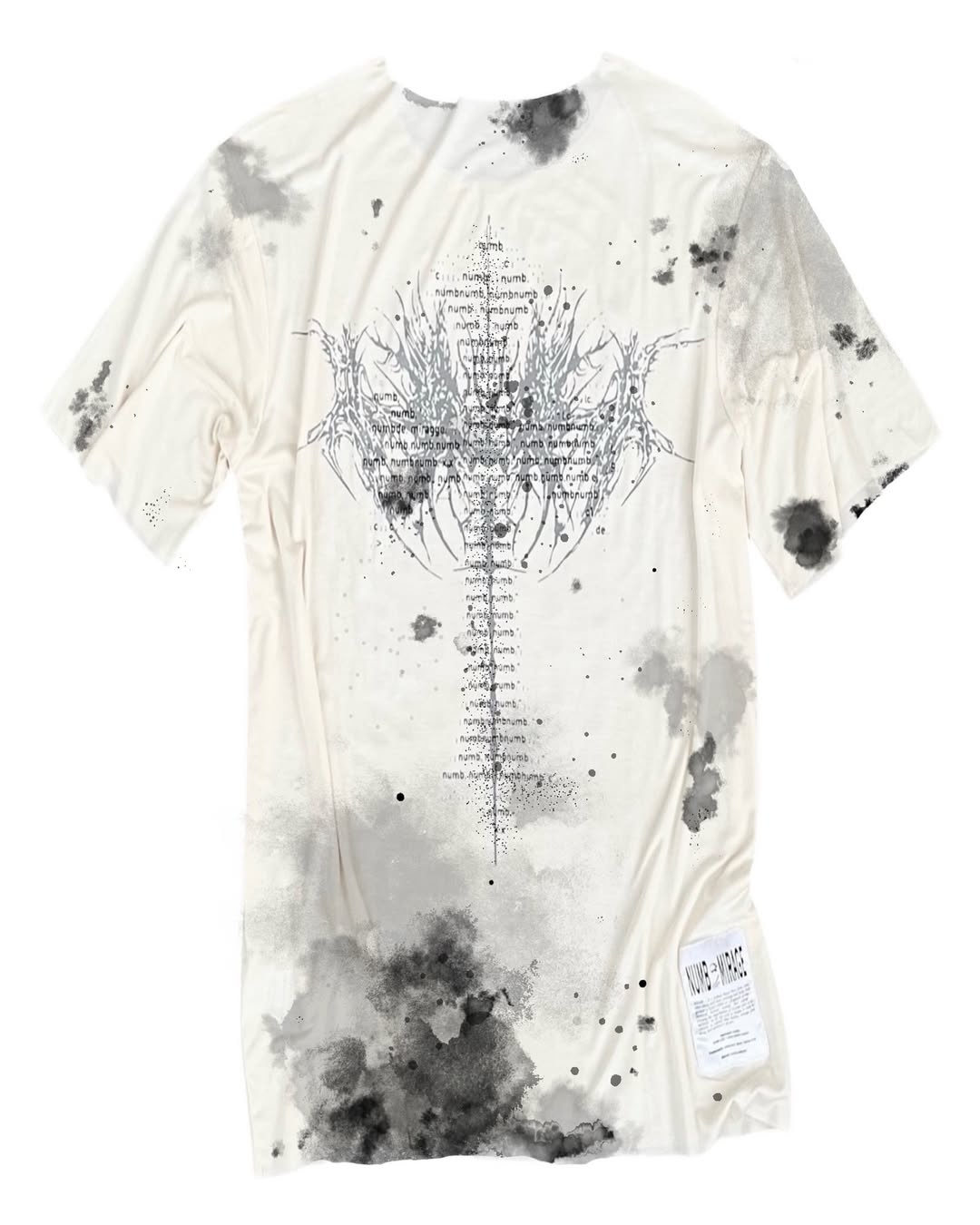 SM L XL Garment Code: NUMB 0257 / Core Capsule Treatment: Distressed / Hand-Aged / Rust Stained Serial: Archive Variant Details: • 100% Cotton, hand-treated and air-dried • Hand-distressed hems and raw edges • Metal staples and mesh hardware detailing • Custom oxidized rust effect, individually unique