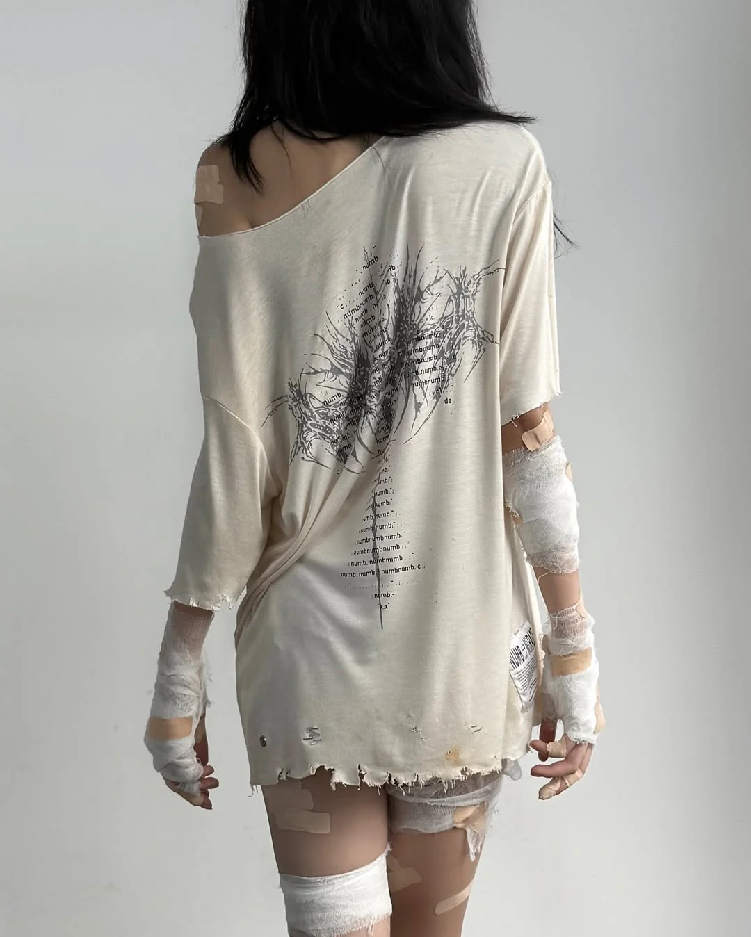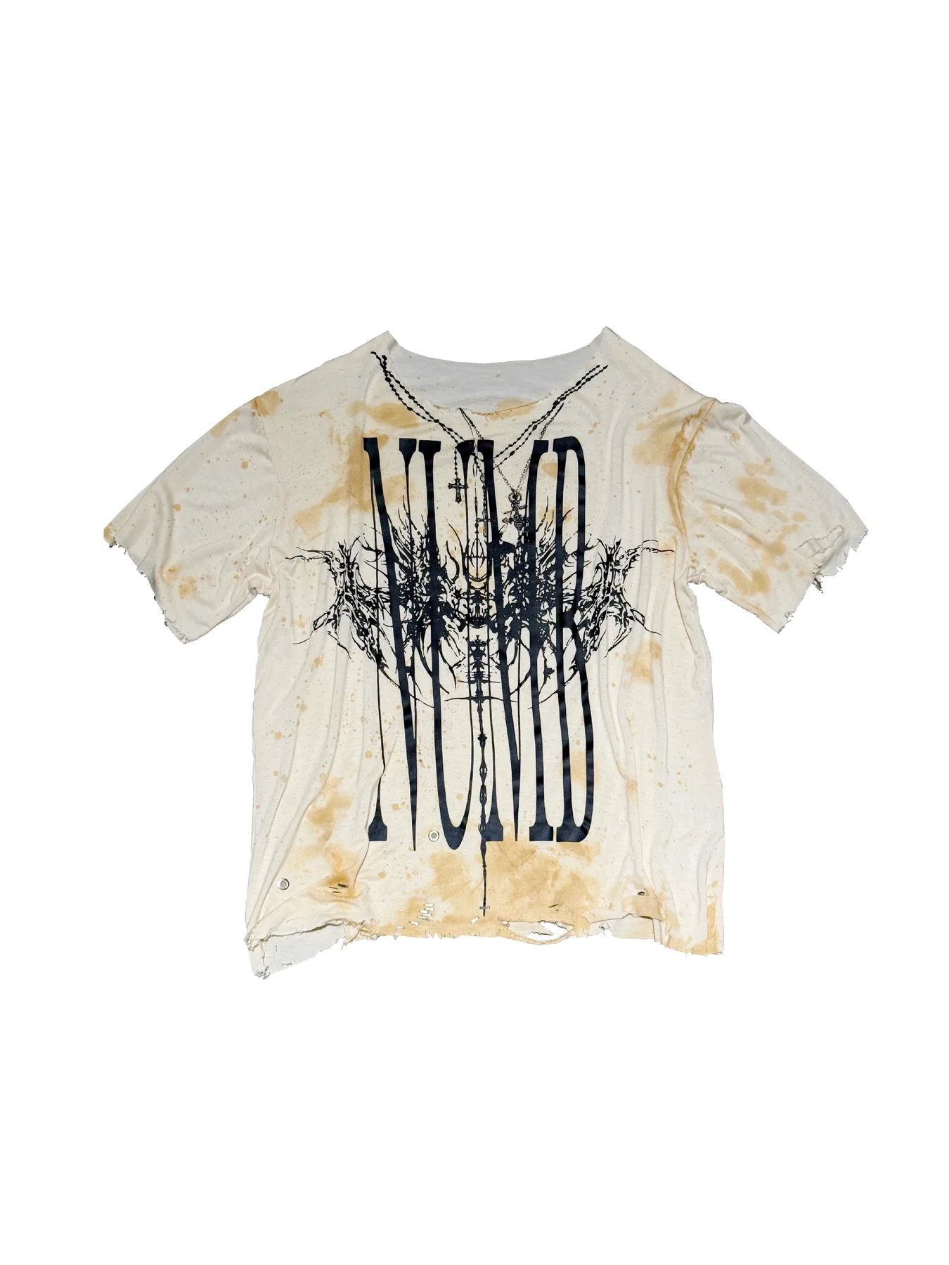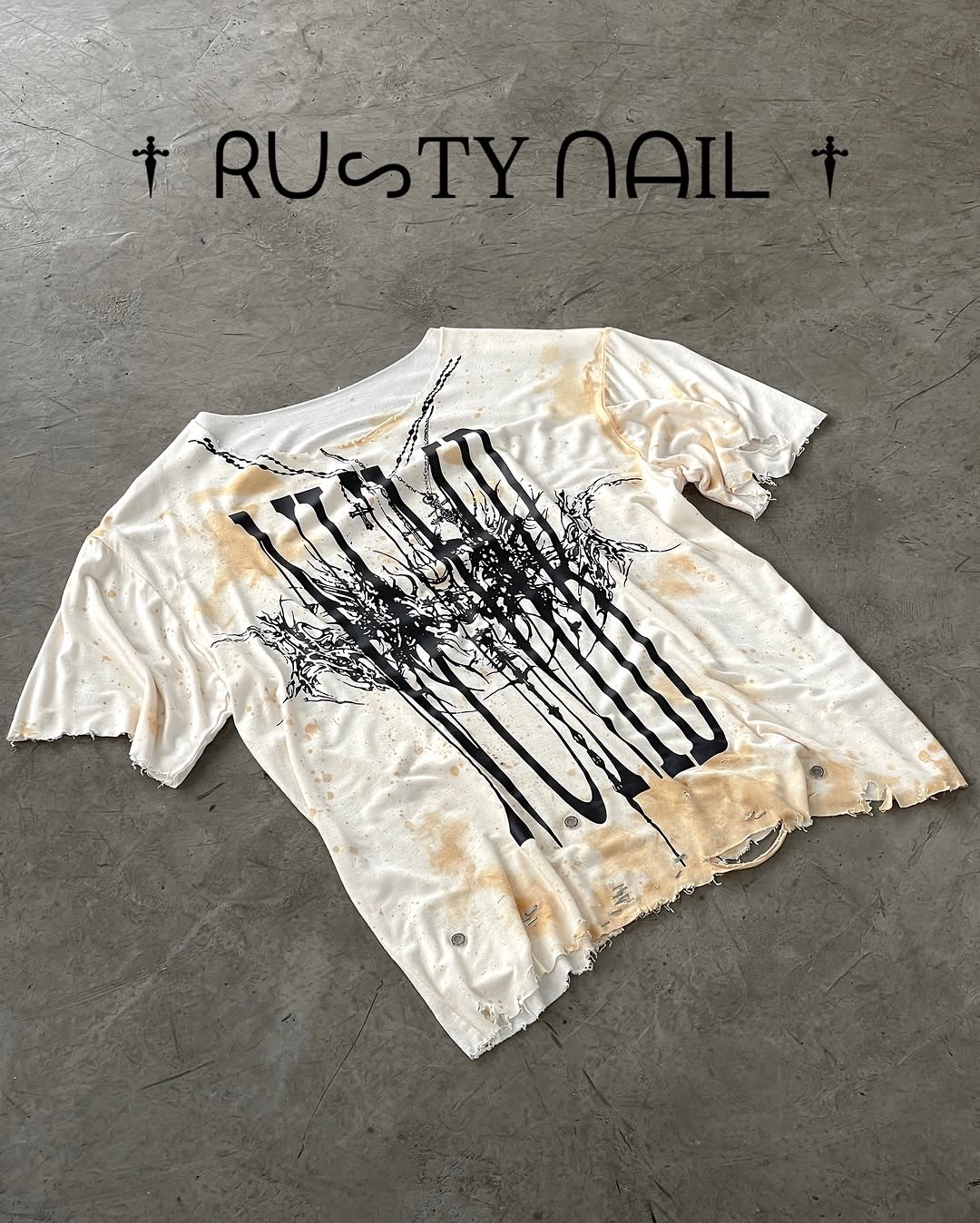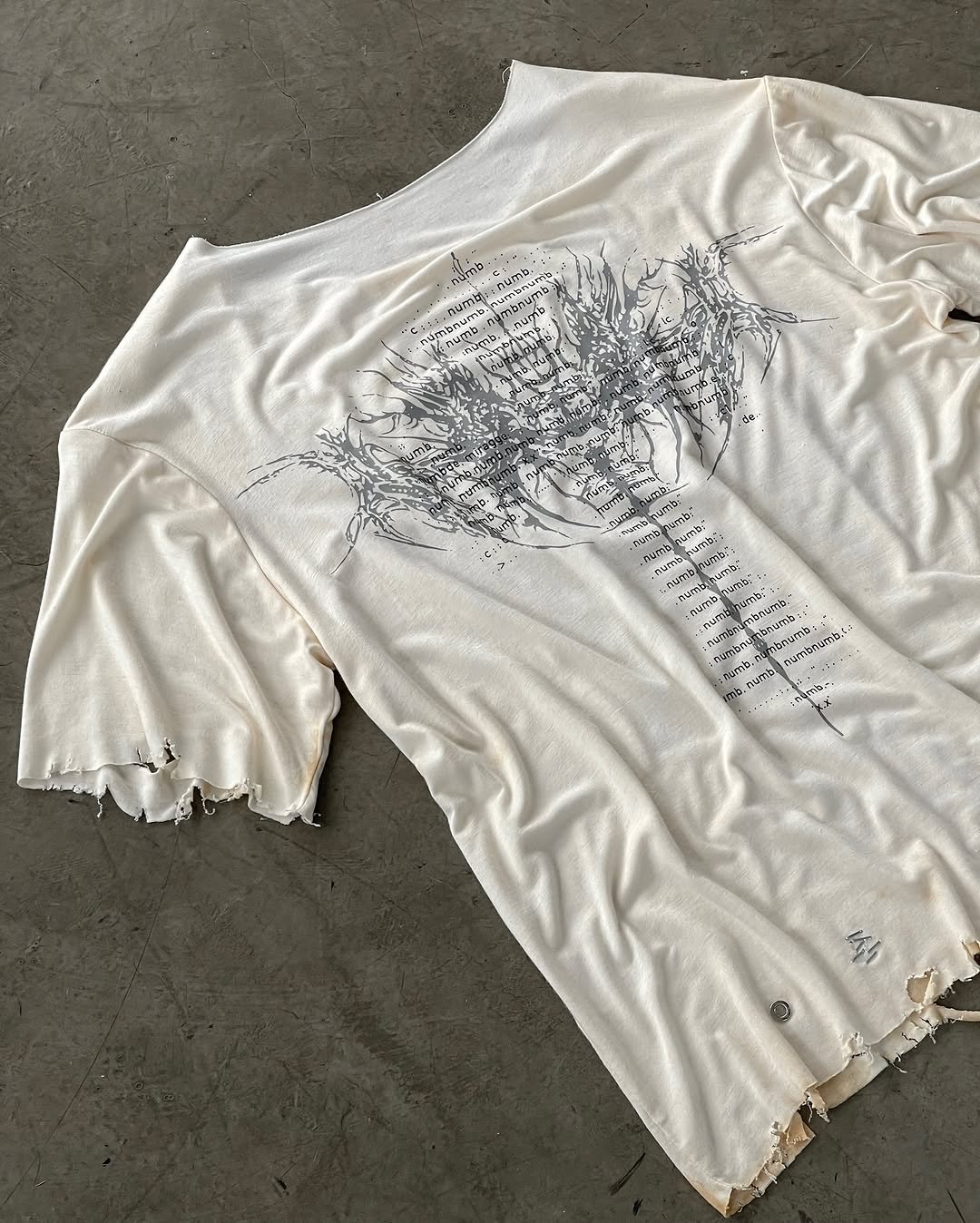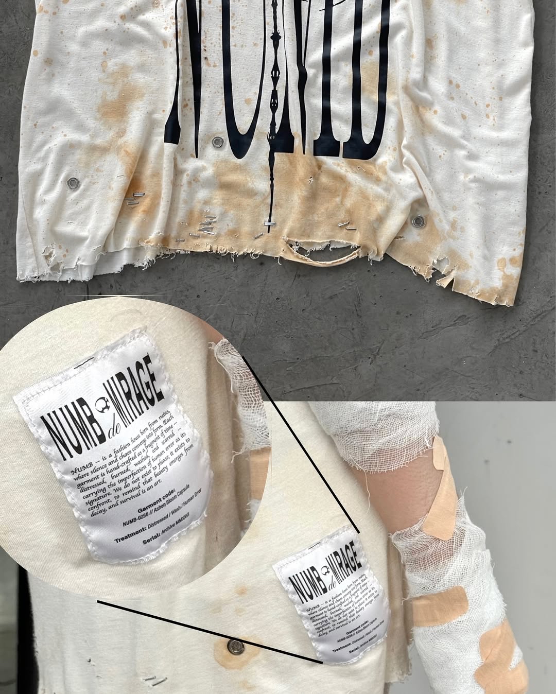 S M L XL Garment Code: NUMB 0257 / Core Capsule Treatment: Distressed / Hand–Aged / Rust Stained Serial: Archive Variant Details: • 100% Cotton, hand-treated and air-dried • Hand-distressed hems and raw edges • Metal staples and mesh hardware detailing • Custom oxidized rust effect, individually unique