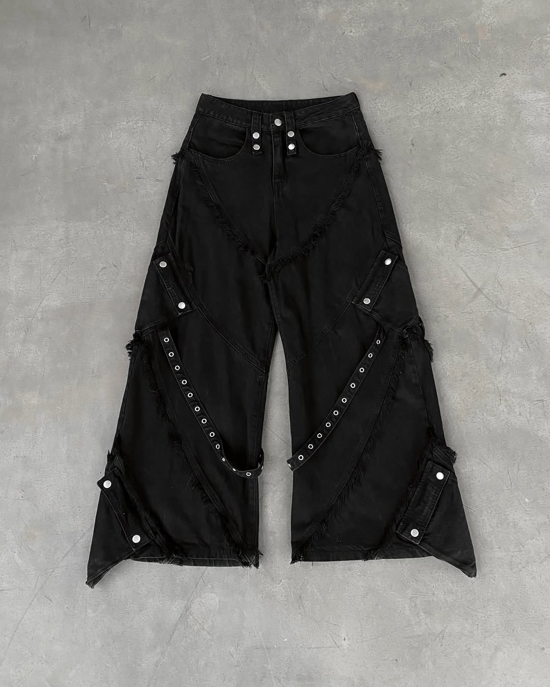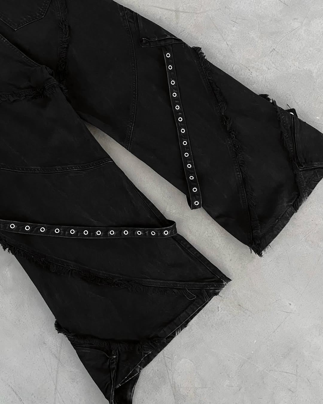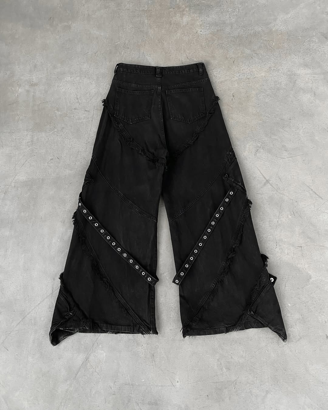Size: S/M/L / XL Details: โข Fabric: 12oz washed black denim โข Wide flare silhouette with asymmetric cut lines โข Frayed edges and raw seam finish โข Silver eyelet straps running across legs โข Double-button waistband with reinforced belt loops โข Front and back pockets โข Distressed hem design for deconstructed look NUMB LABEL