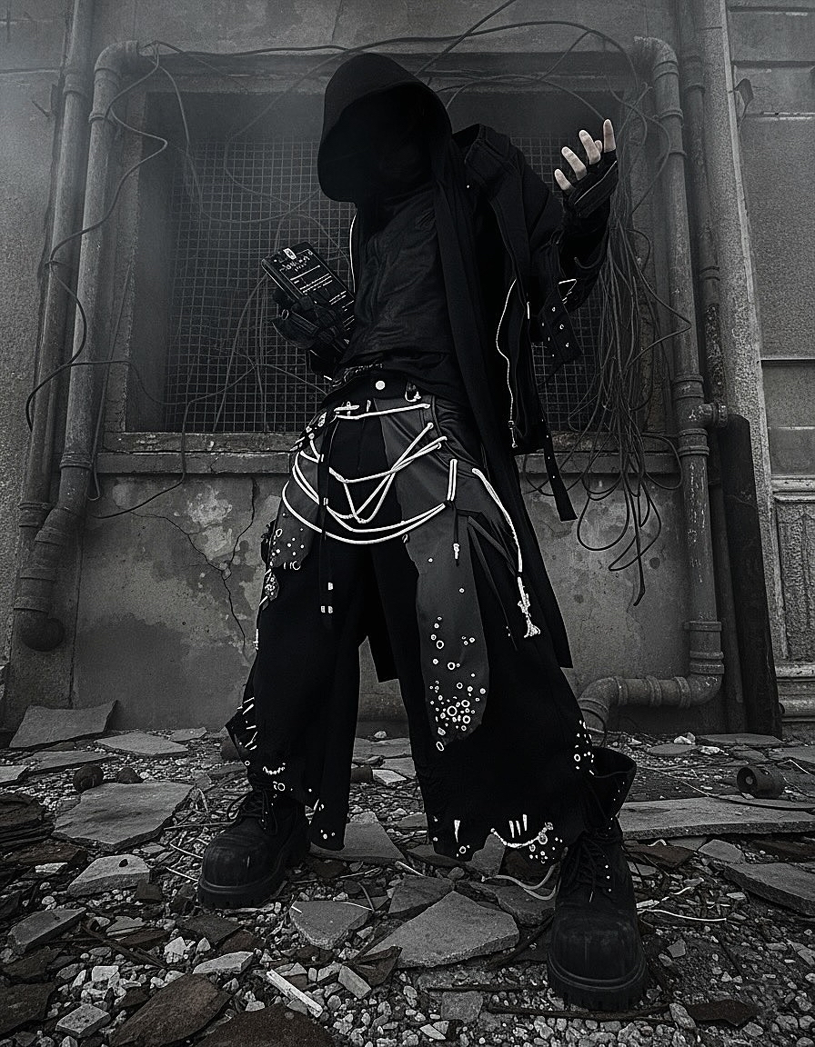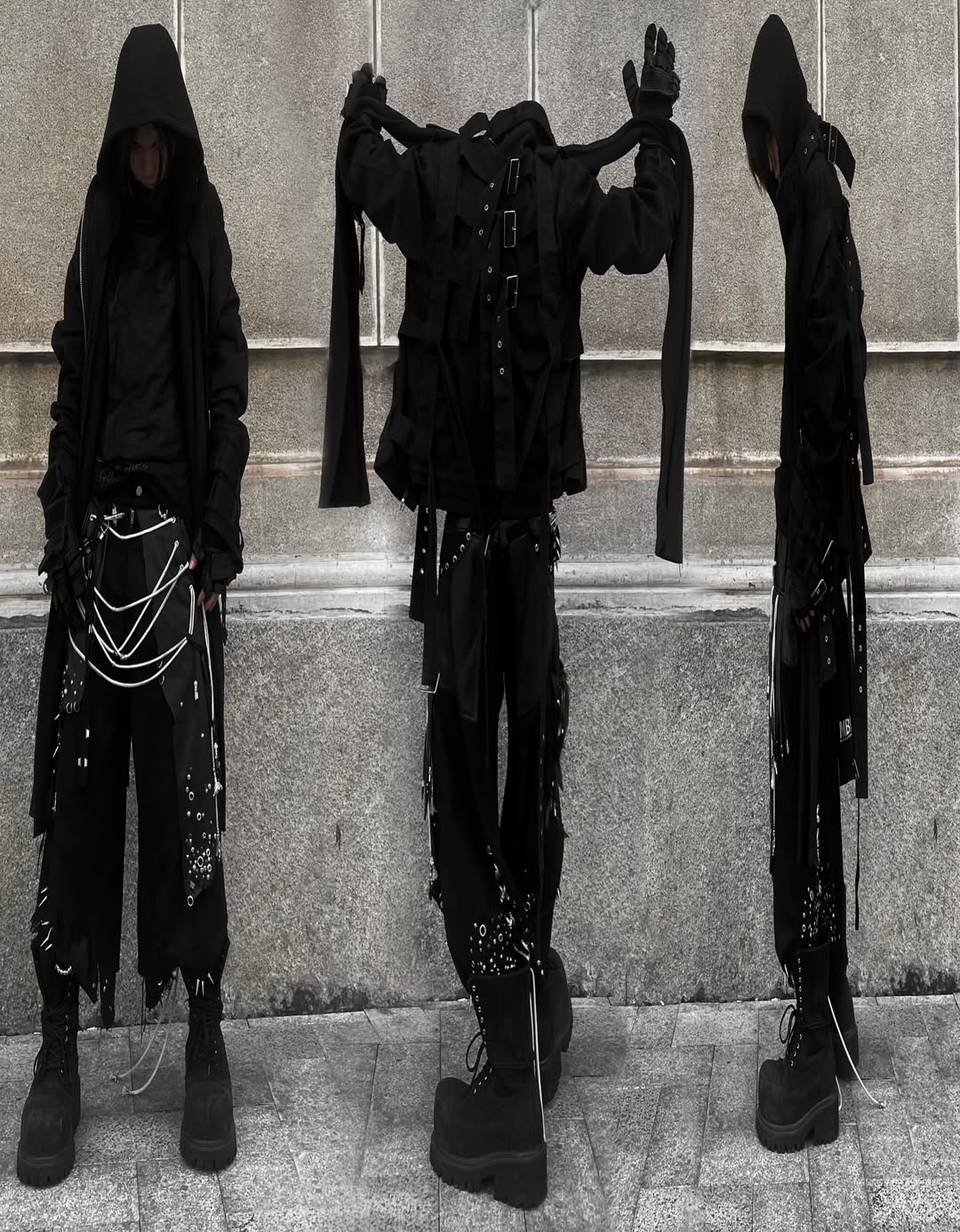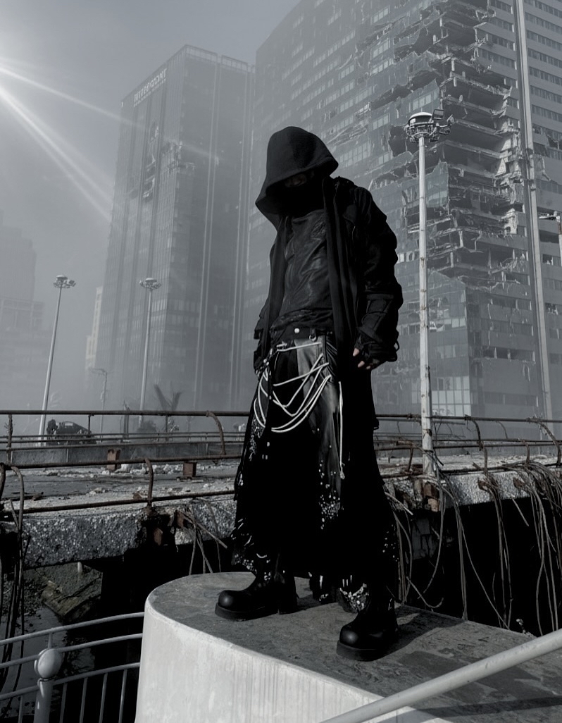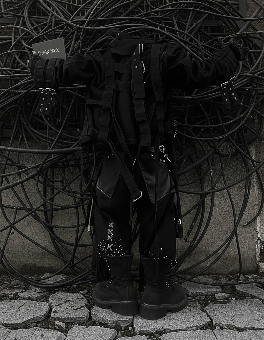 Size: S M L XL 100% handcrafted -Materials: premium leather, heavyweight denim -Fully hand-applied hardware and embellishments -Each piece is one of a kind Wide-leg shorts meticulously handcrafted from layered black denim and leather. Each metal detail - including studs, rings, spikes, and charms โ is individually applied by hand, resulting in a garment that embodies both raw destruction and refined craftsmanship Please direct us for more information /.