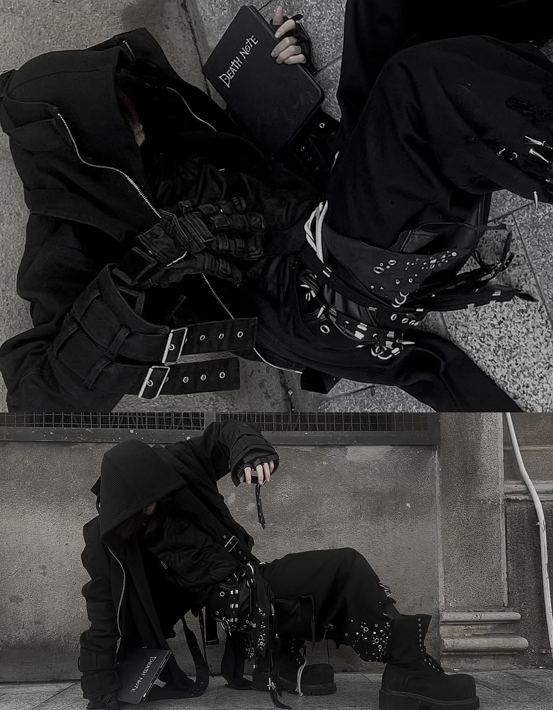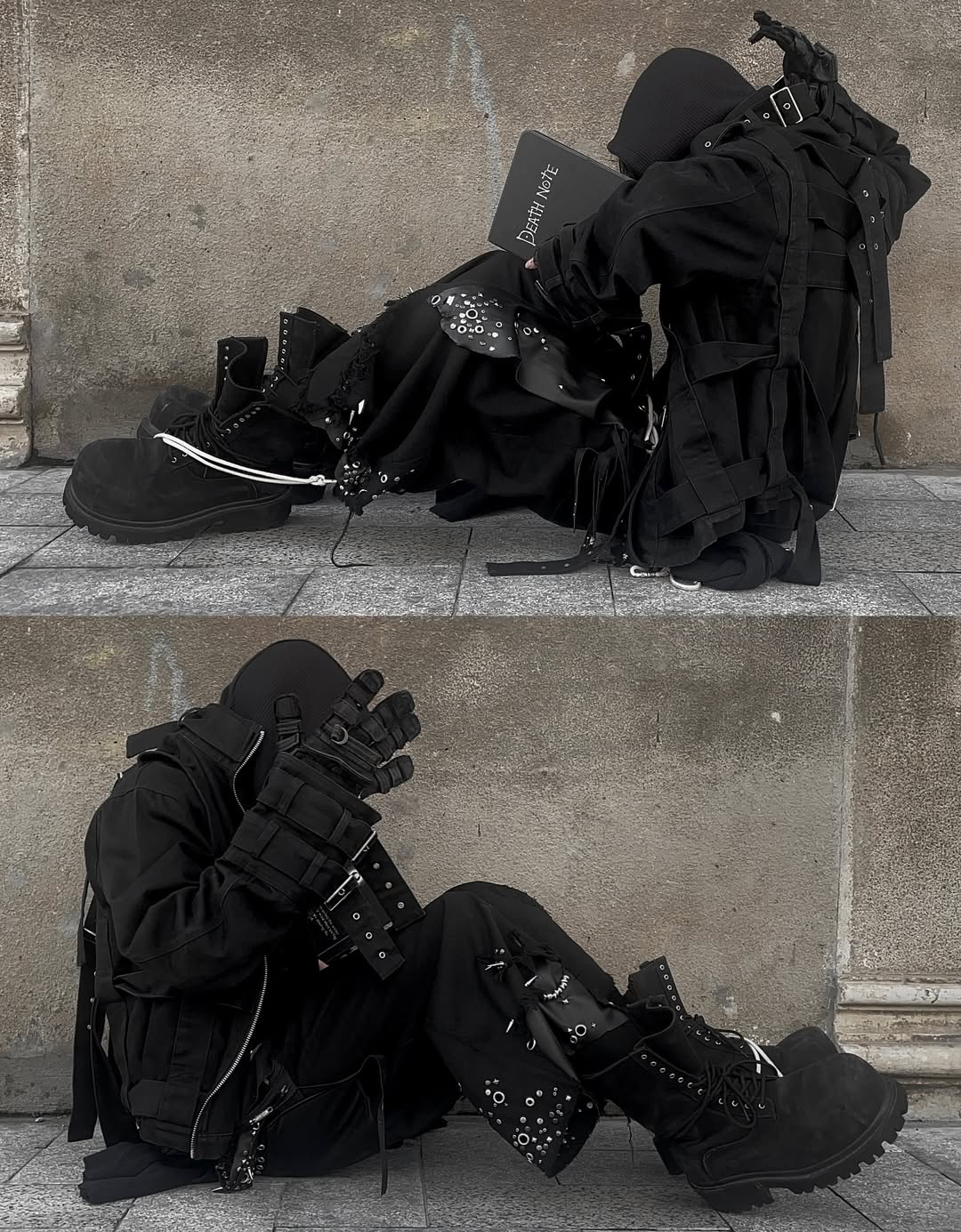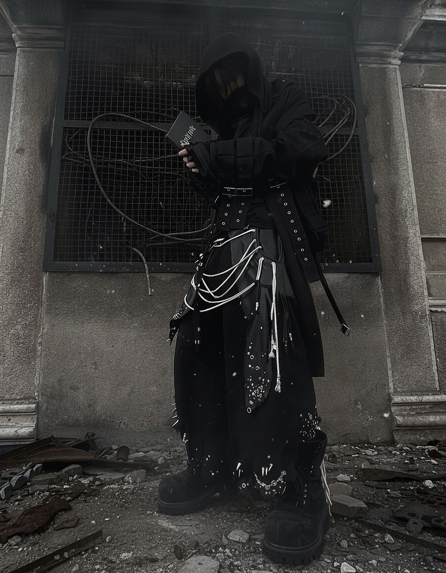 Size: S M L XL 100% handcrafted -Materials: premium leather, heavyweight denim -Fully hand-applied hardware and embellishments -Each piece is one of a kind Wide-leg shorts meticulously handcrafted from layered black denim and leather. Each metal detail - including studs, rings, spikes, and charms โ is individually applied by hand, resulting in a garment that embodies both raw destruction and refined craftsmanship Please direct us for more information /.