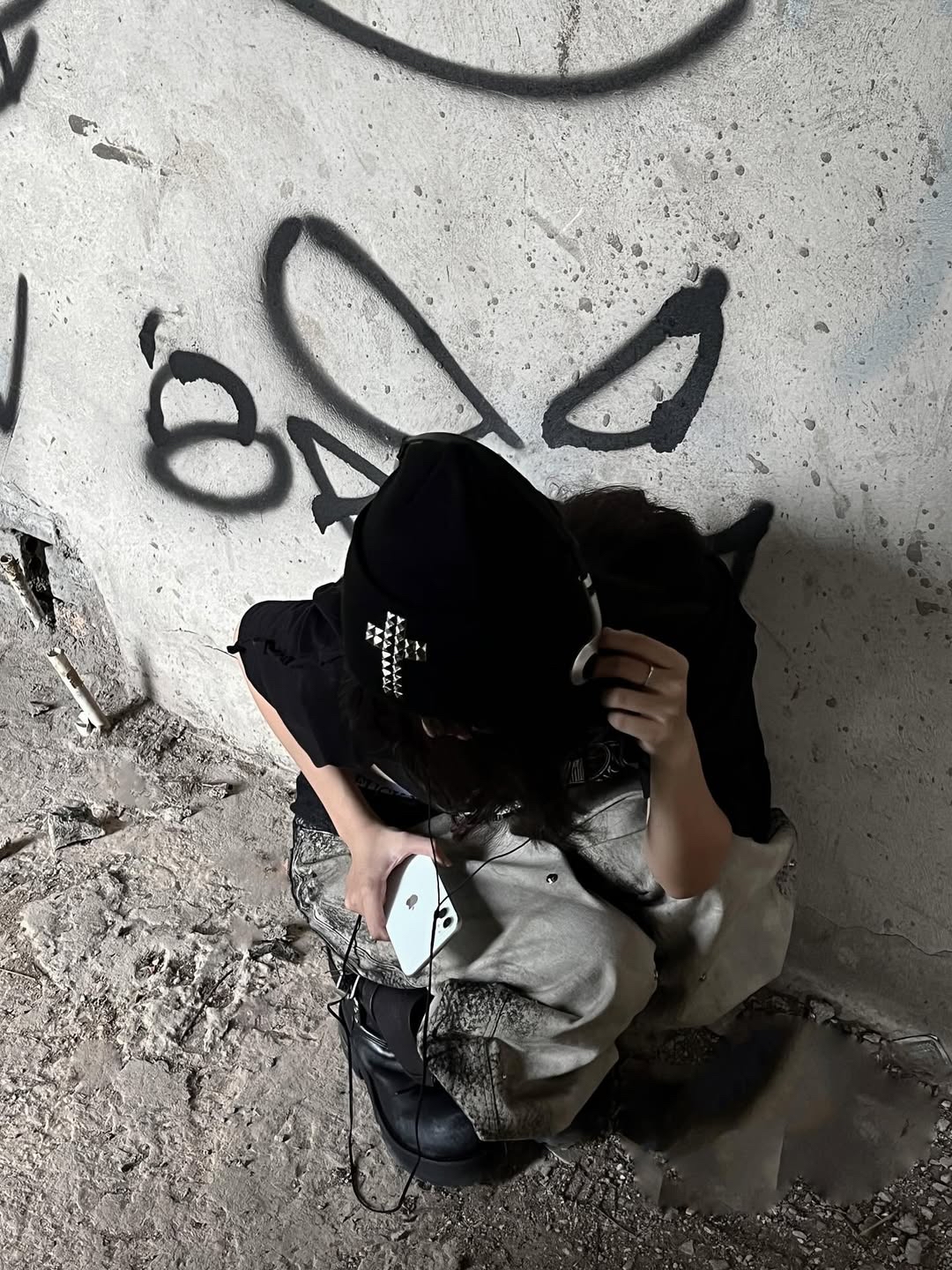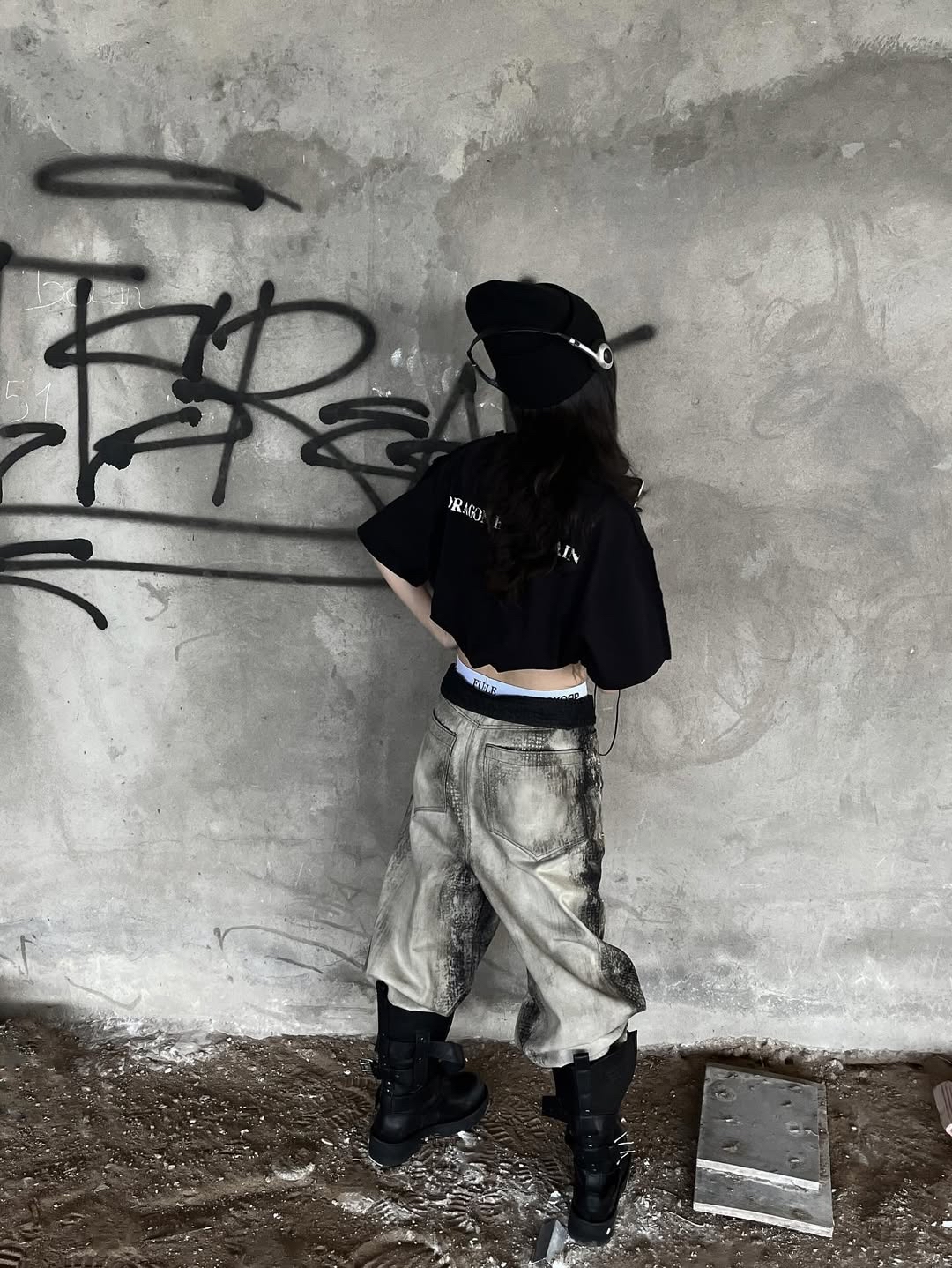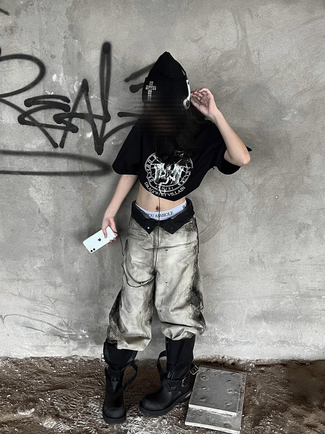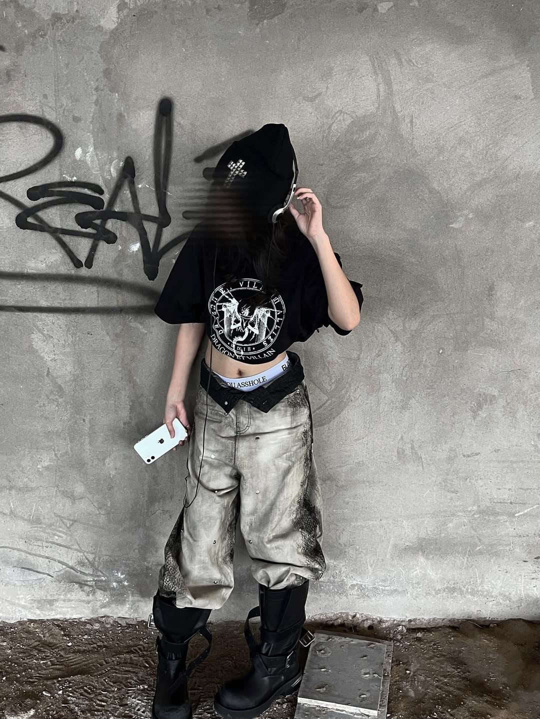 Size: S, M, L , XL Form: Low rise Wide-leg Detail: โข 100 % HAND MADE โข Ash-washed wide-leg silhouette with hand-distressed burn effects โข 24 hand-applied stud & tack components across the body โข Sharp spike rivets line the lower hem โ subtle, weapon-like finish โข Unique forged waistband button for raw closure โข Each piece slightly varies due to manual wash and distressing