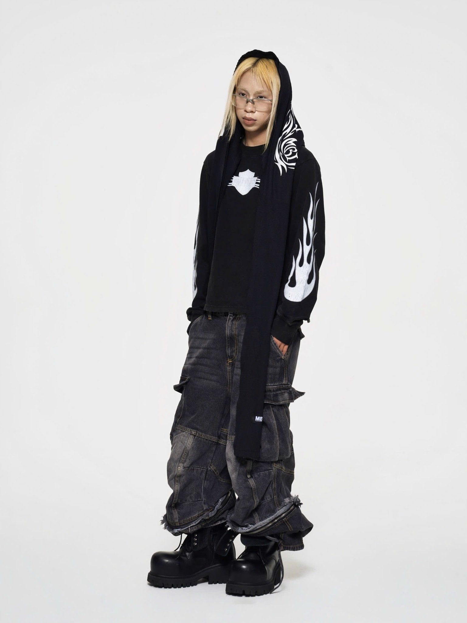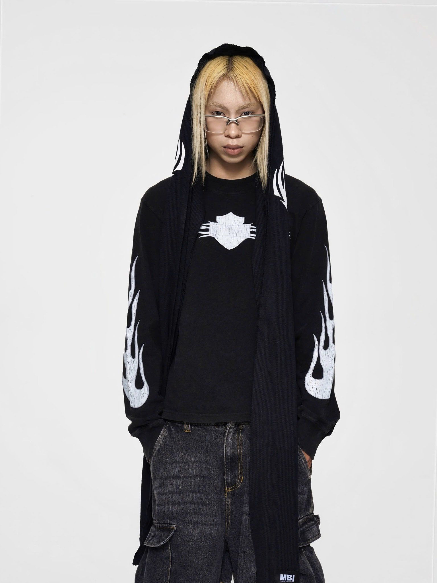 To depict - Color: Black | White - Material: 100% cotton (honeycomb wool) - Size: D240 x R40 (cm) - Details: 2 layers, raw cut edges, silk screen printing