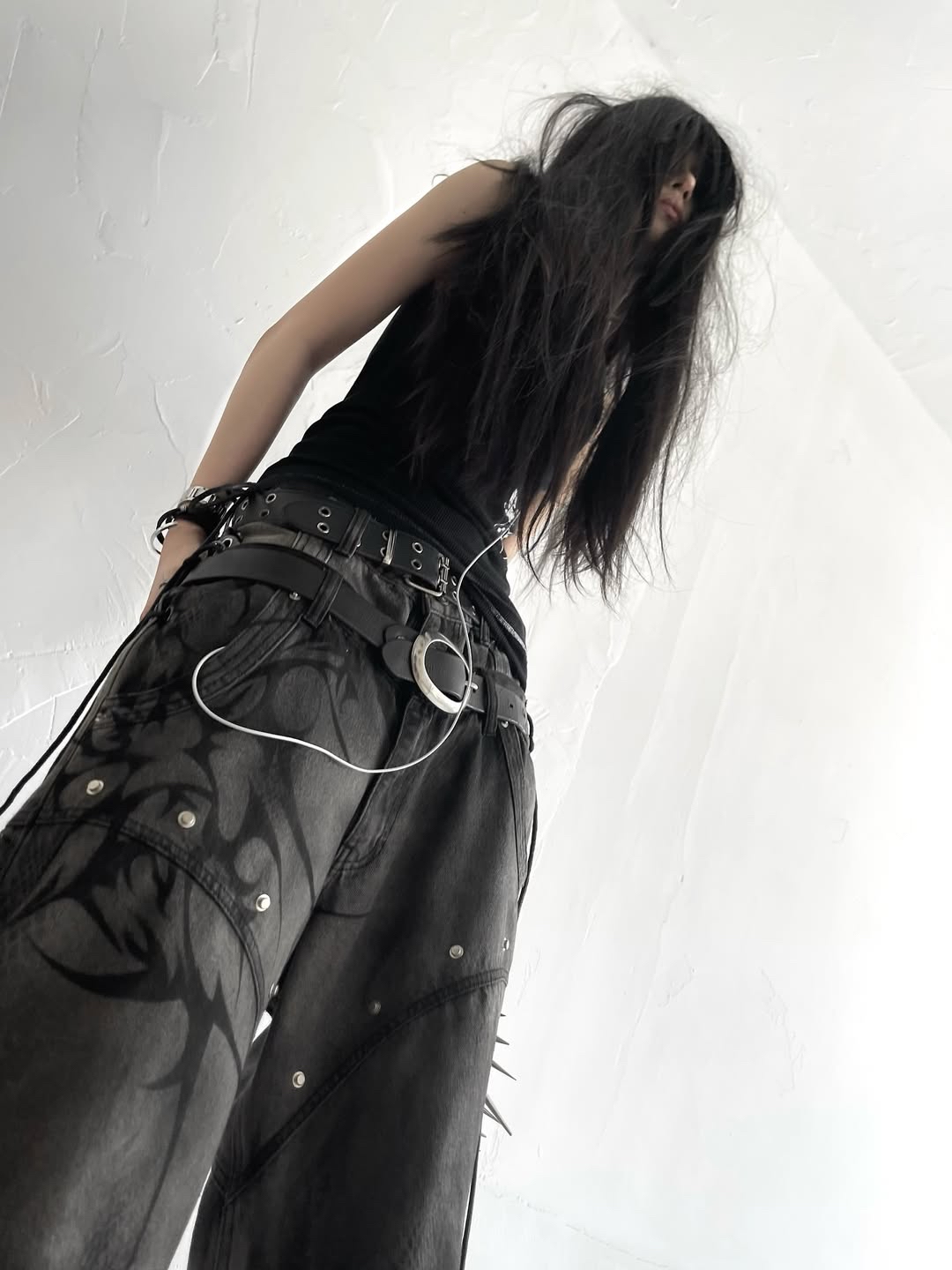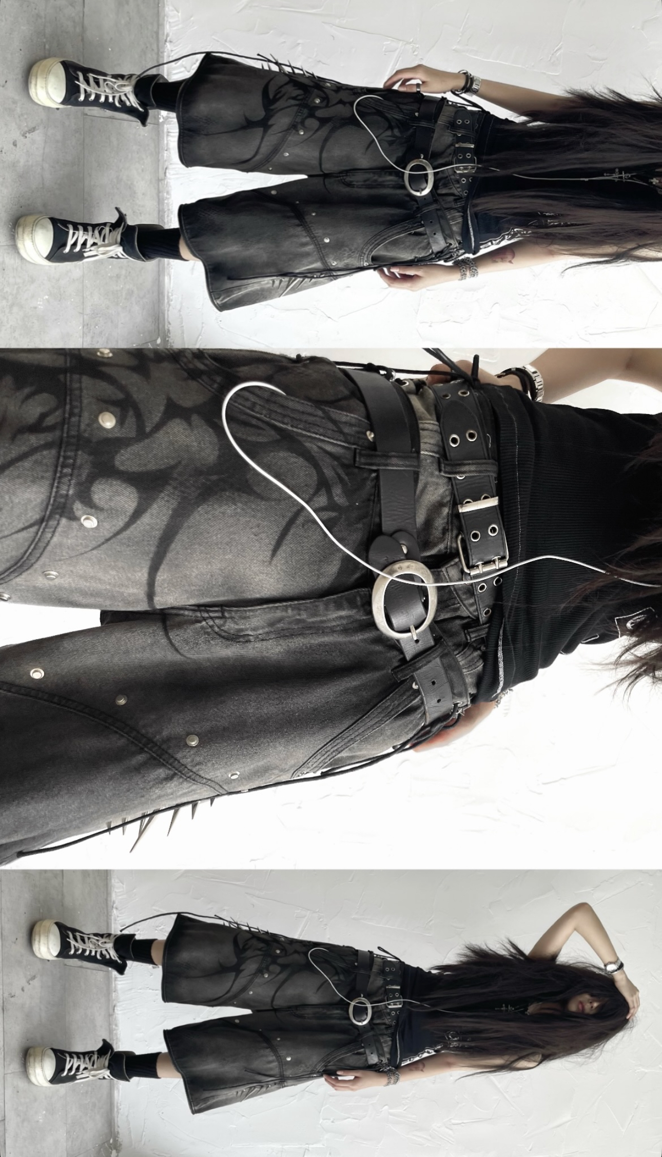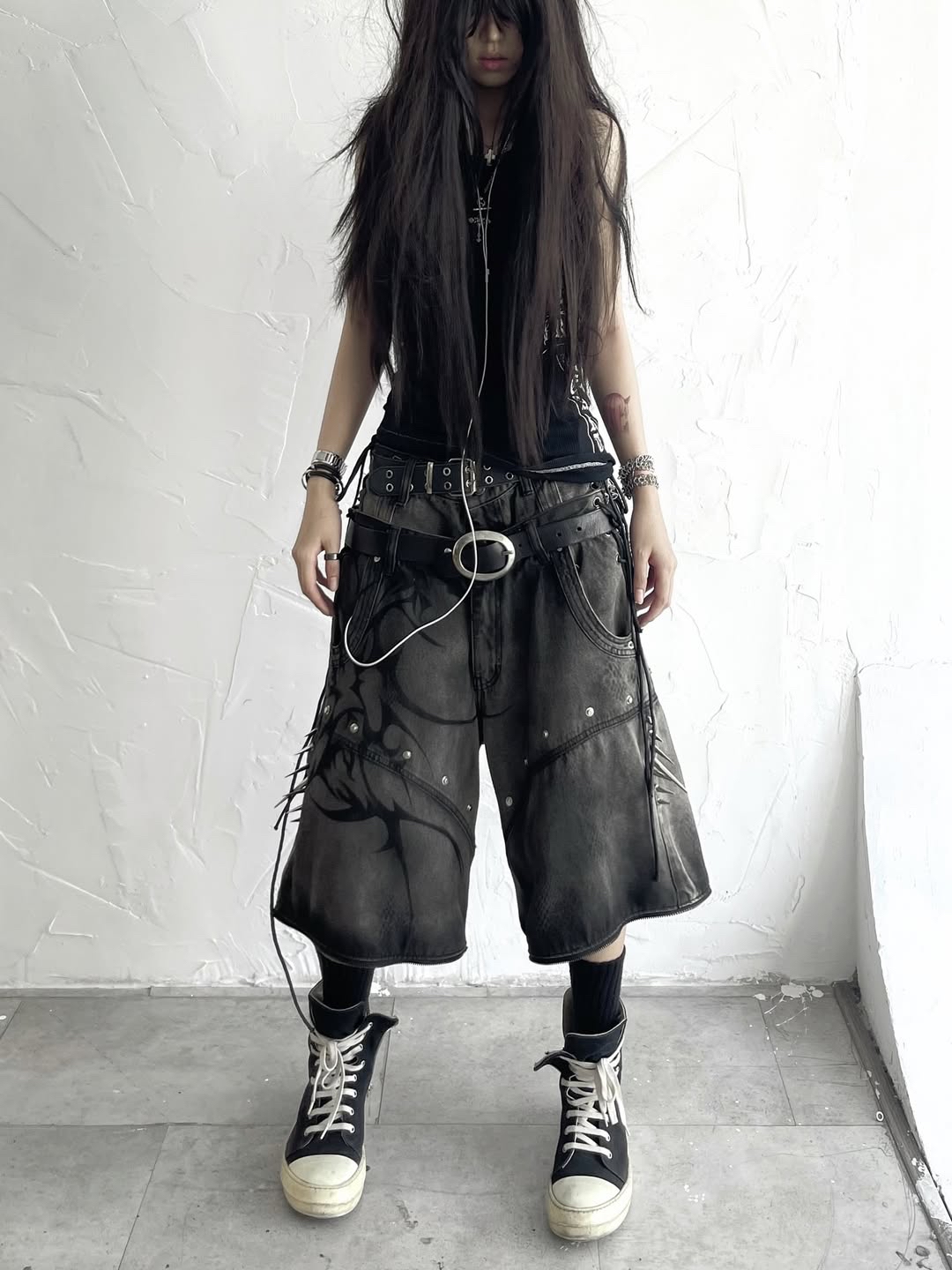 Size: S M L XL Details: โข Fabric: 13.5oz denim with silver wash & subtle snake-skin texture โข Full black tribal airbrush on front panels โข Double-layer high waist with adjustable side corset ties โข Studs & metal spikes on both thighs - hidden weapon vibes โข Hidden zipper system allows full transformation into 3-piece shorts โข Wide-leg silhouette with industrial-cut structure for a strong form โข 2-in-1 detachable design - switch between full-length and short mode