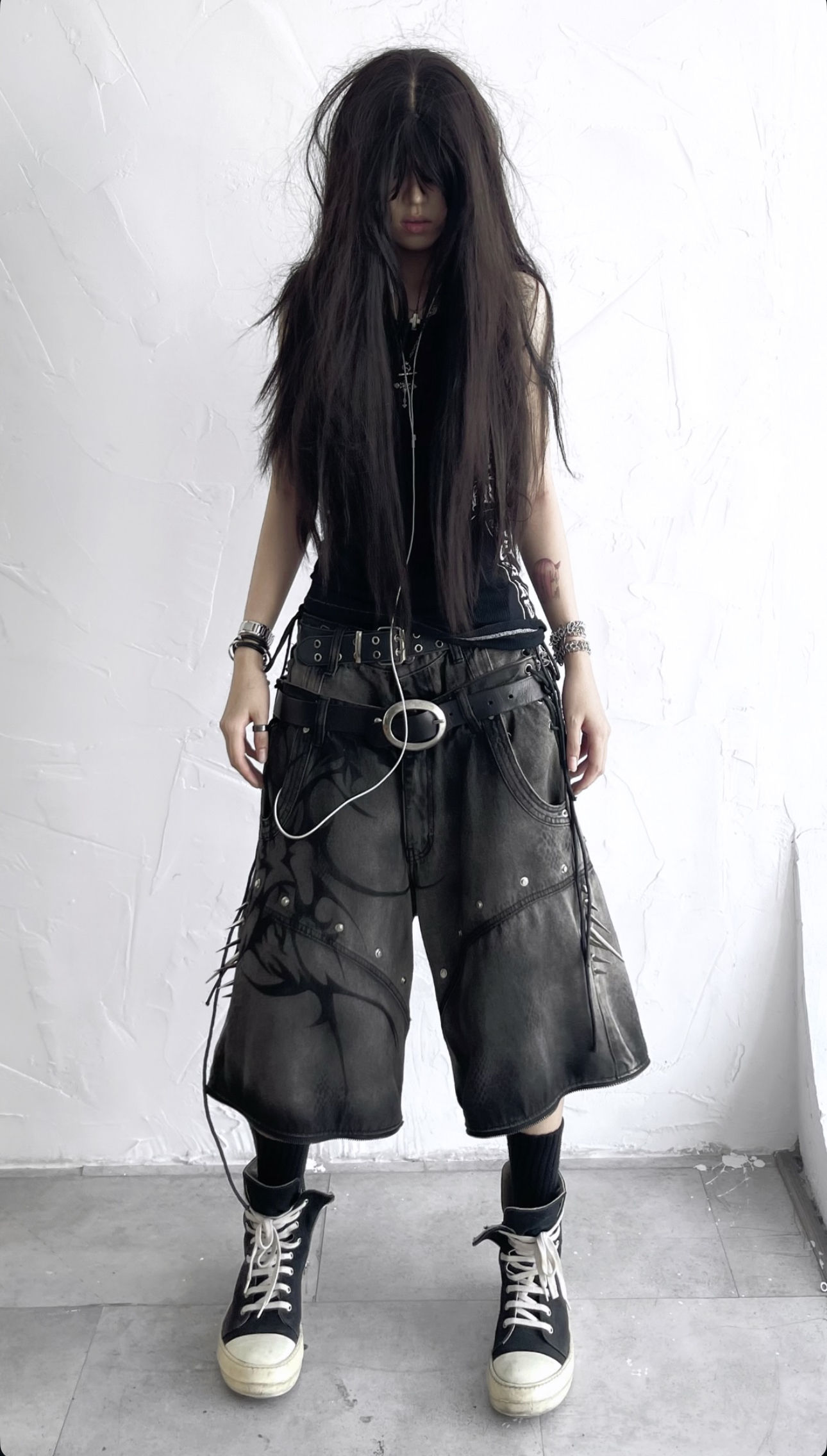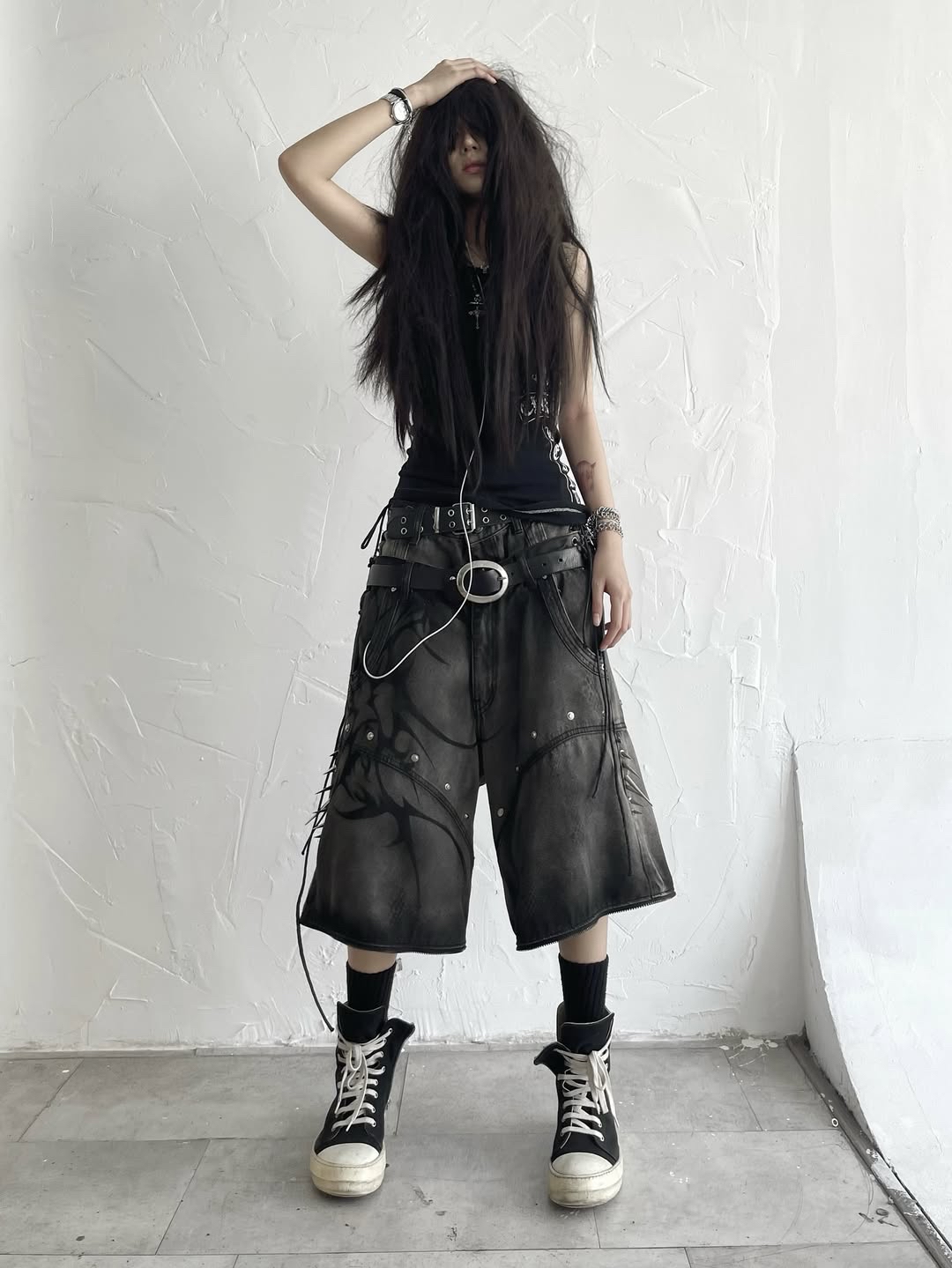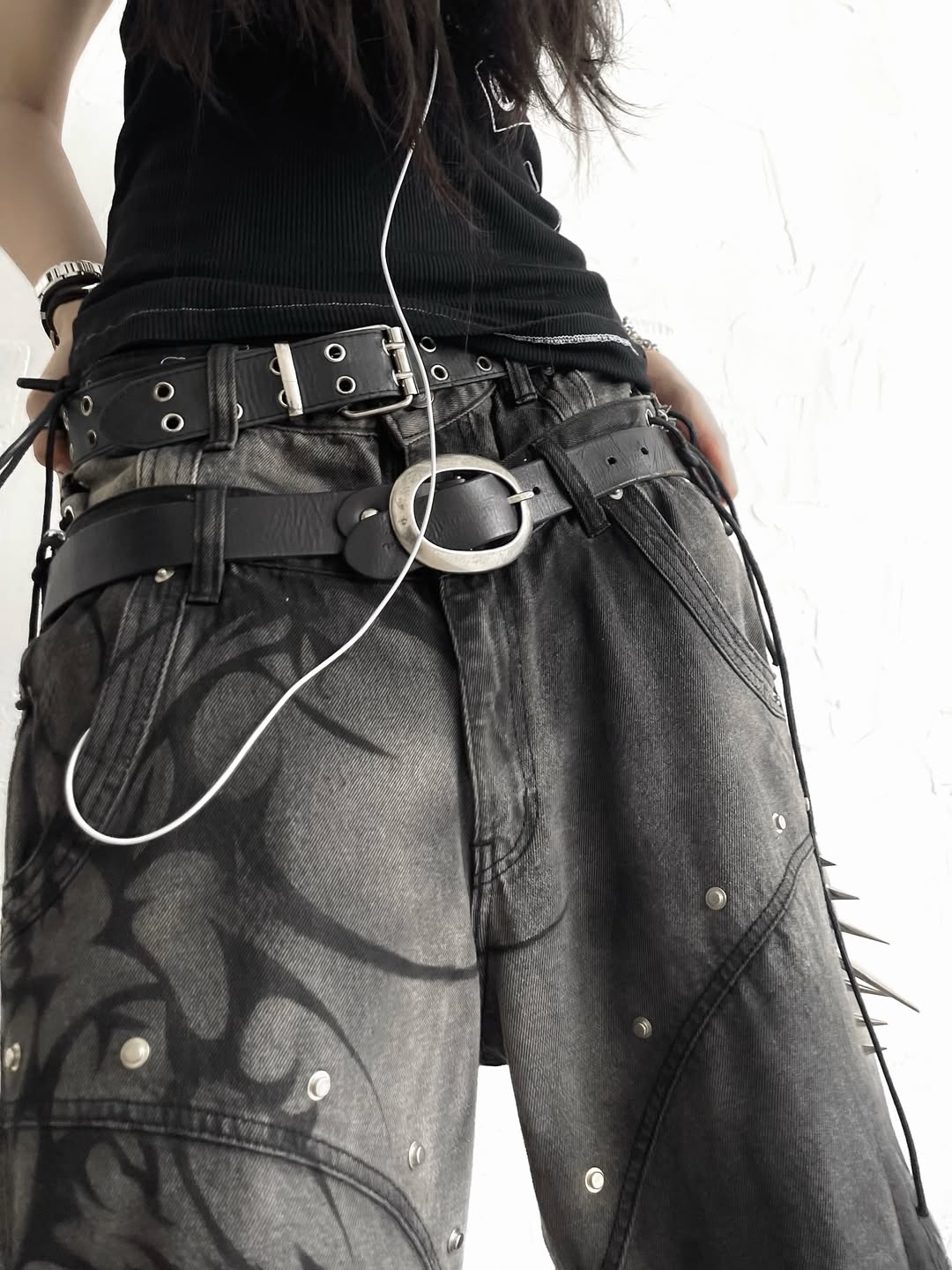 Size: S M L XL Details: โข Fabric: 13.5oz denim with silver wash & subtle snake-skin texture โข Full black tribal airbrush on front panels โข Double-layer high waist with adjustable side corset ties โข Studs & metal spikes on both thighs - hidden weapon vibes โข Hidden zipper system allows full transformation into 3-piece shorts โข Wide-leg silhouette with industrial-cut structure for a strong form โข 2-in-1 detachable design - switch between full-length and short mode