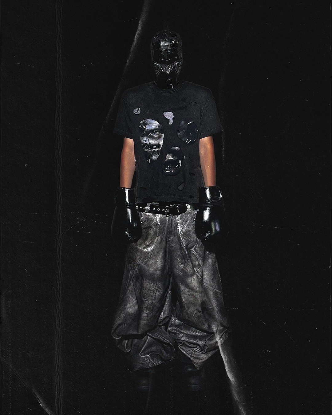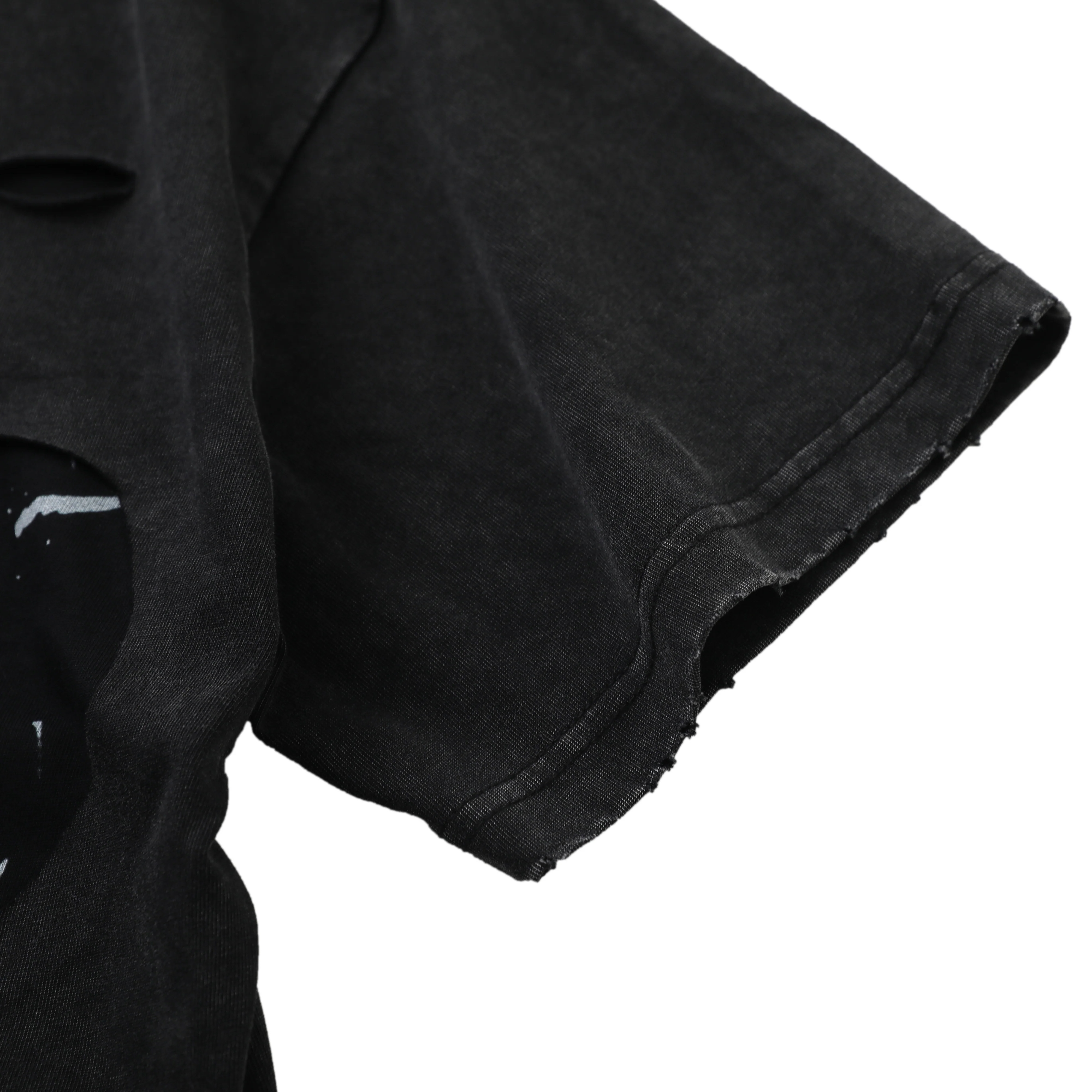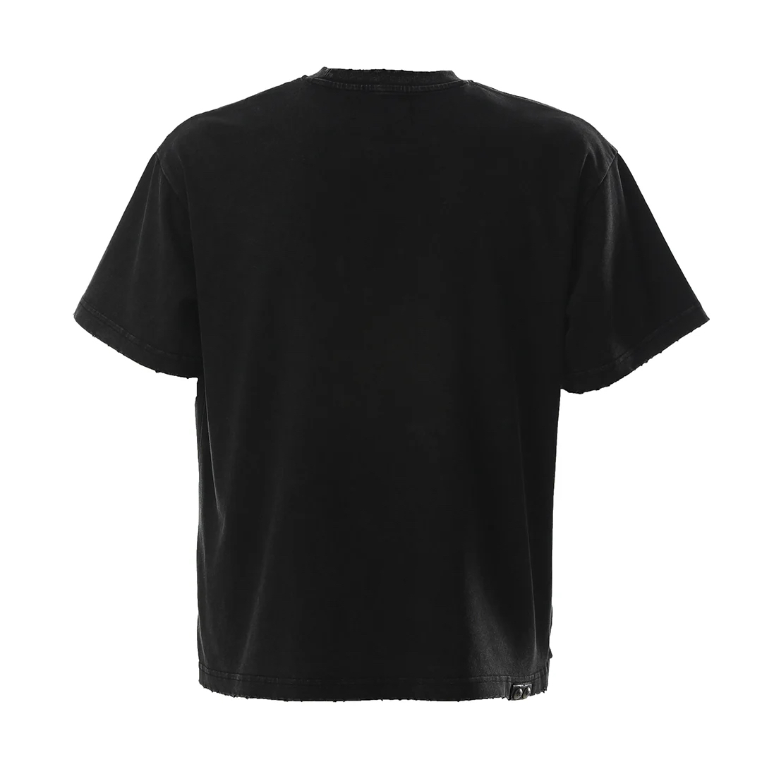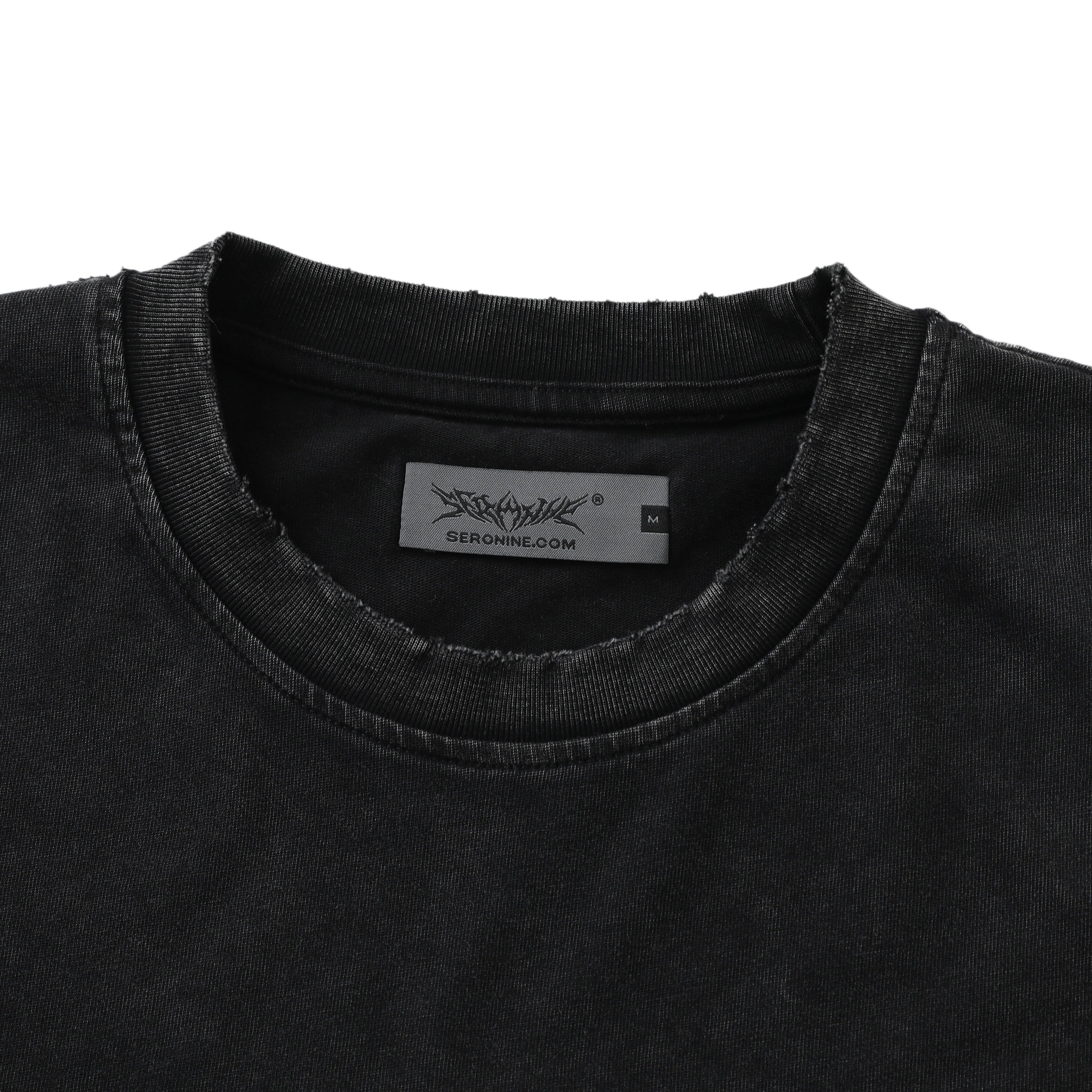 Construction & Craft Details ยท 100% cotton, treated with an all-over garment wash and aging process for a fissured, worn-in surface texture. ยท Chest graphic: โPsychic Fissure Schematic,โ produced via digital printing combined with laser-cut elements; hand-set and bonded to build dimensional layers. ยท Fully handcraftedโdistressing, cutting, and detail placementโso each piece is one of a kind.