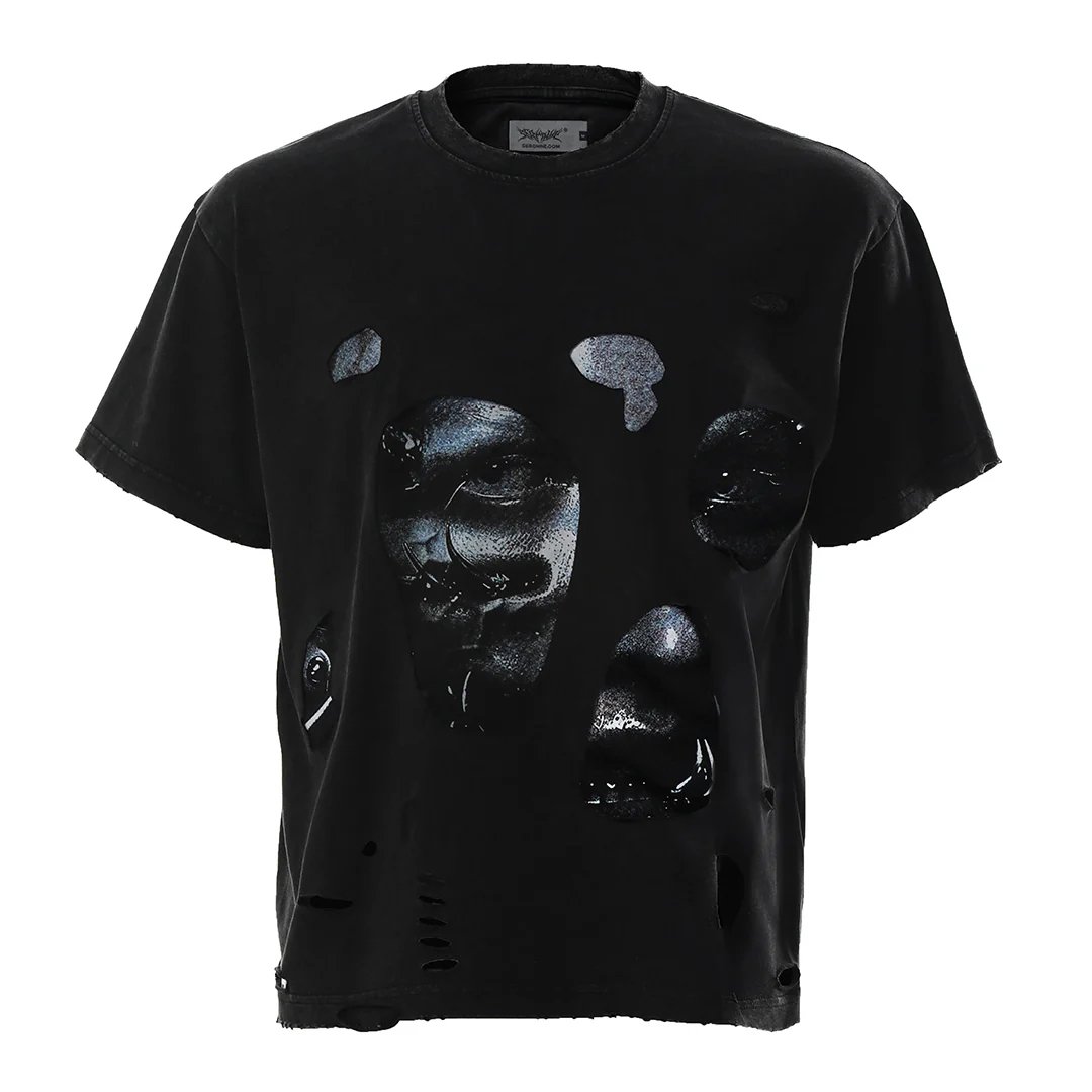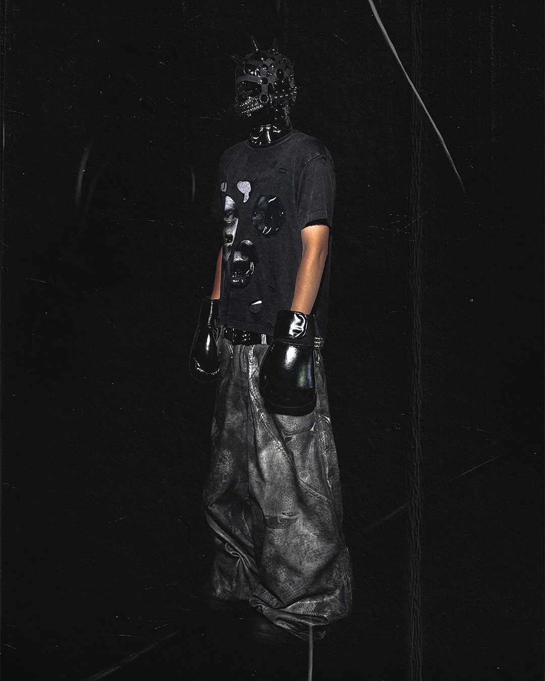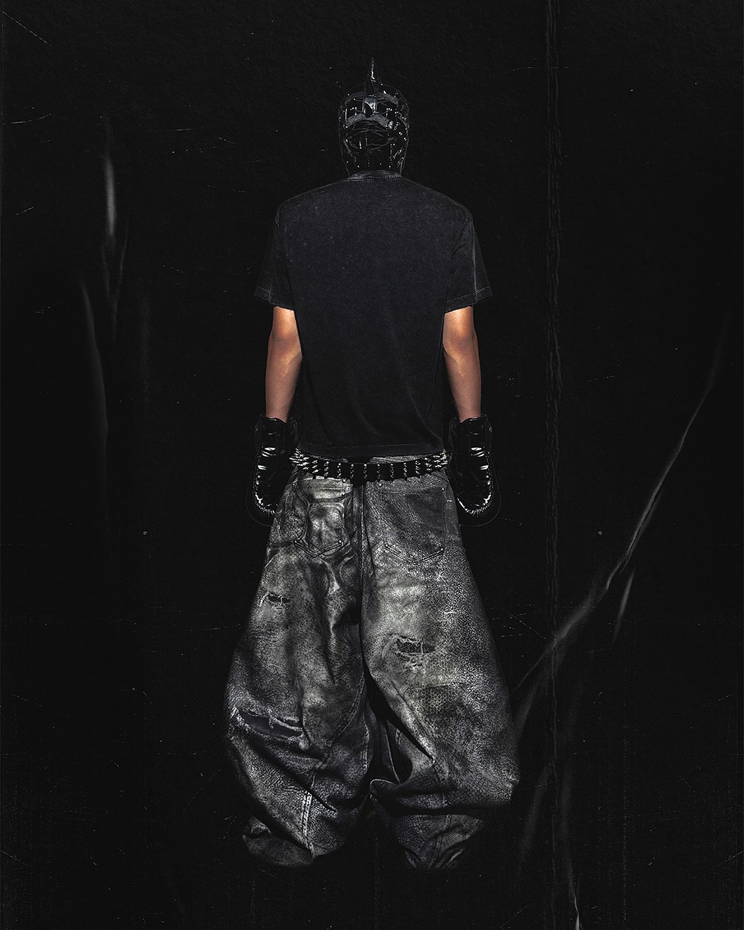 Construction & Craft Details ยท 100% cotton, treated with an all-over garment wash and aging process for a fissured, worn-in surface texture. ยท Chest graphic: โPsychic Fissure Schematic,โ produced via digital printing combined with laser-cut elements; hand-set and bonded to build dimensional layers. ยท Fully handcraftedโdistressing, cutting, and detail placementโso each piece is one of a kind.