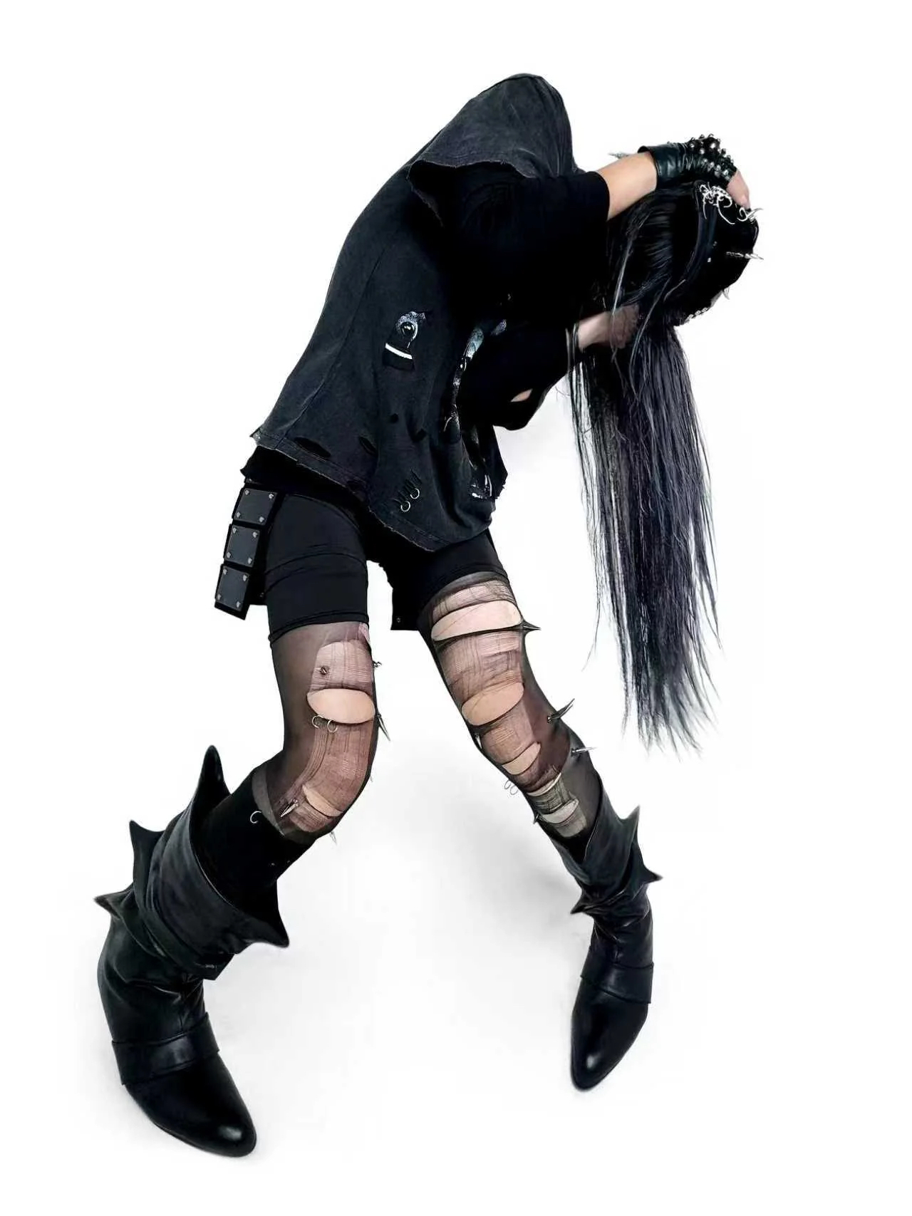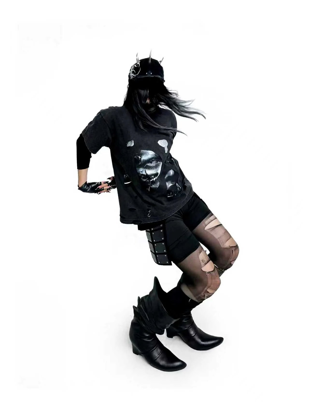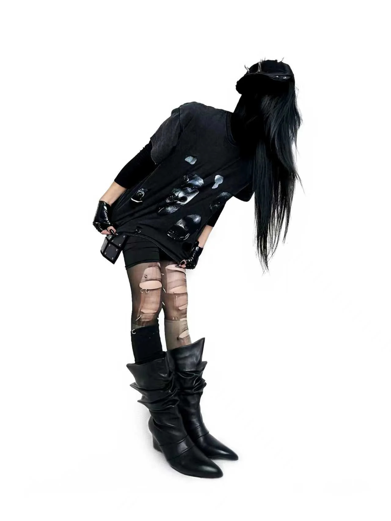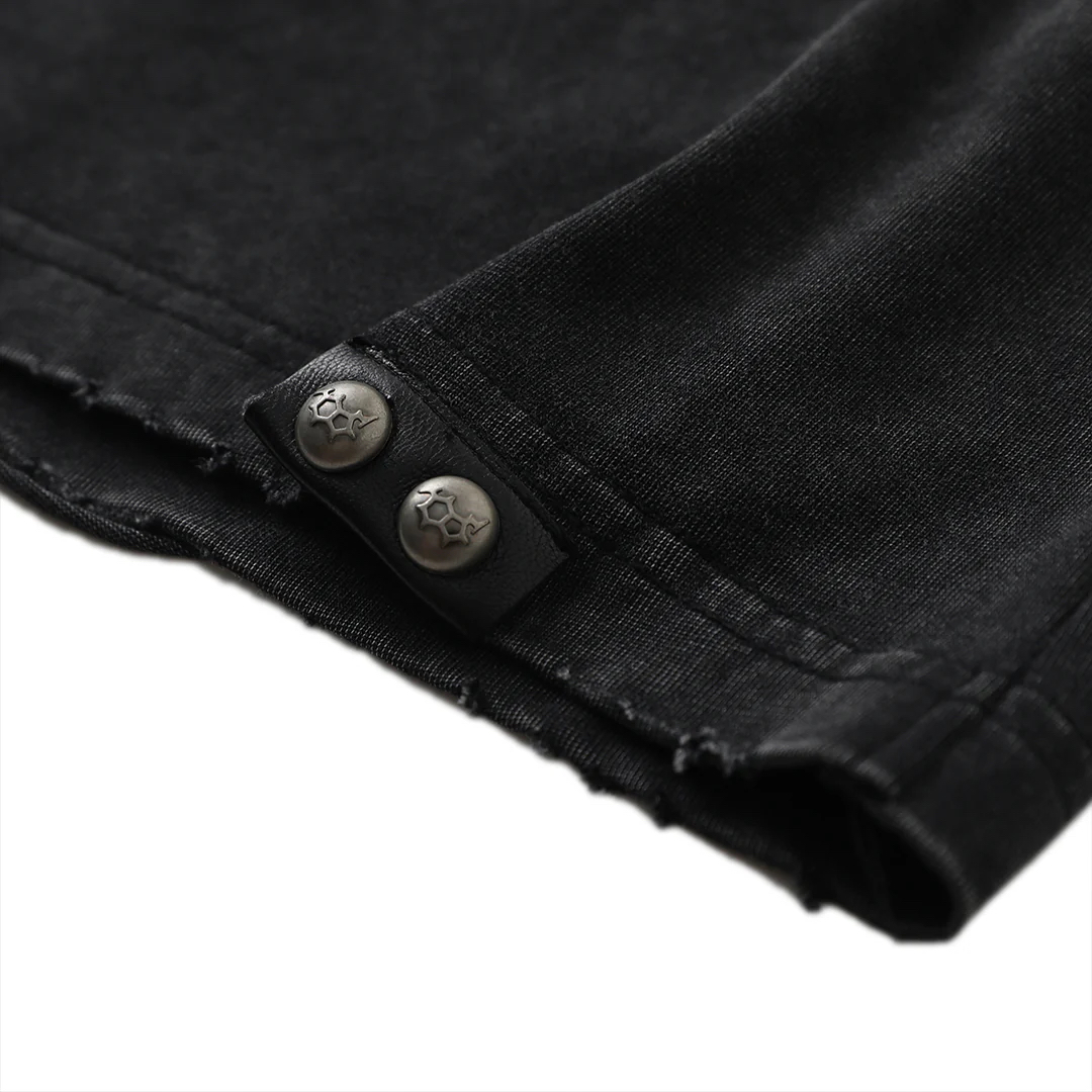 Construction & Craft Details ยท 100% cotton, treated with an all-over garment wash and aging process for a fissured, worn-in surface texture. ยท Chest graphic: โPsychic Fissure Schematic,โ produced via digital printing combined with laser-cut elements; hand-set and bonded to build dimensional layers. ยท Fully handcraftedโdistressing, cutting, and detail placementโso each piece is one of a kind.